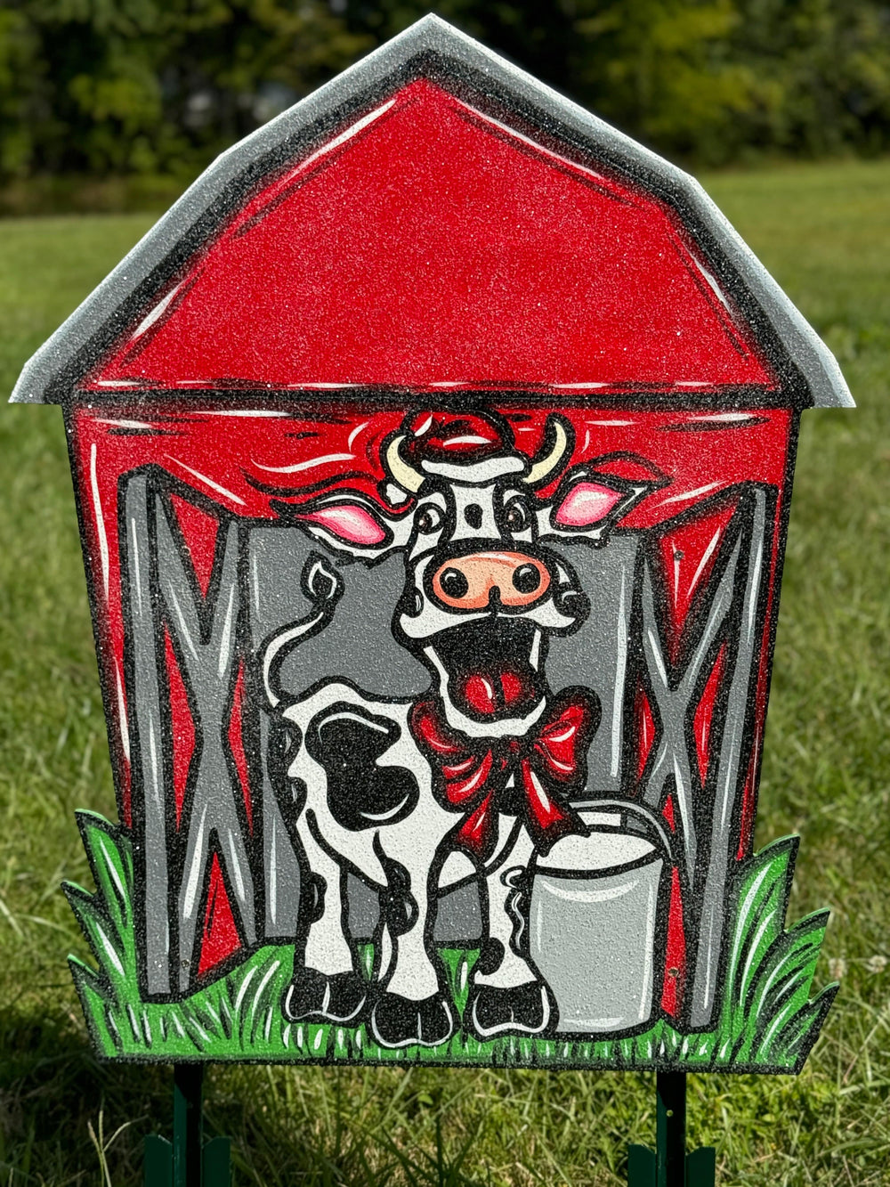 Christmas Cow Barn Yard Sign – Funny Farmhouse Outdoor Decor | Red Barn Garden Critter | Holiday Cutout for Christmas Lawn