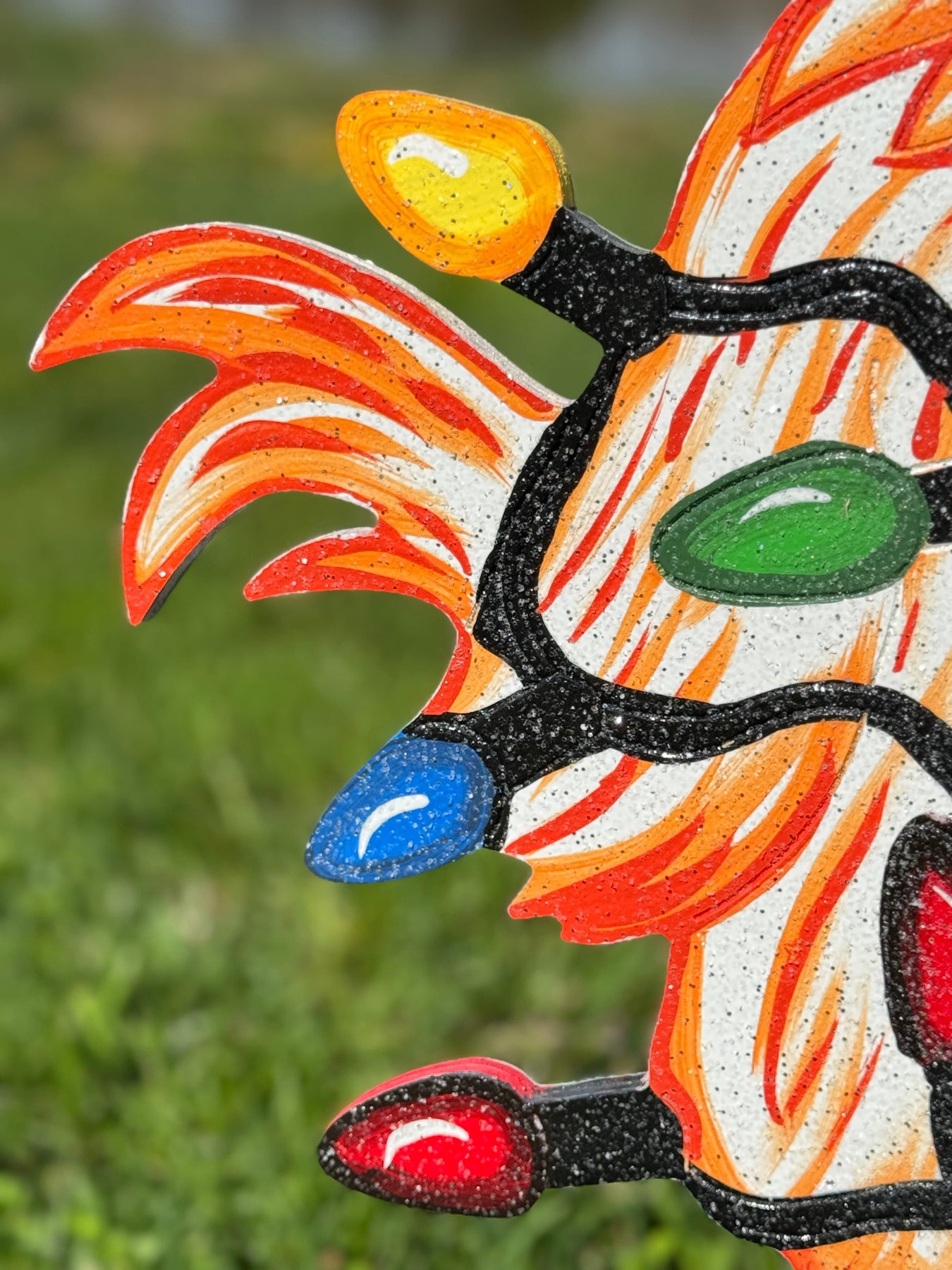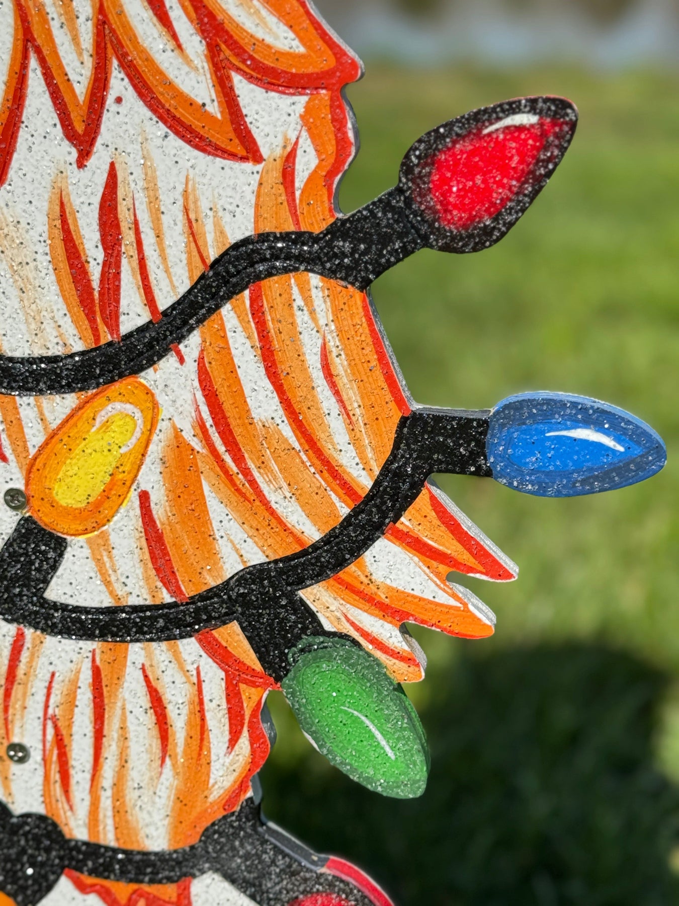 The Chicken wrapped in Christmas lights lawn sign is 26" tall x 22" wide.