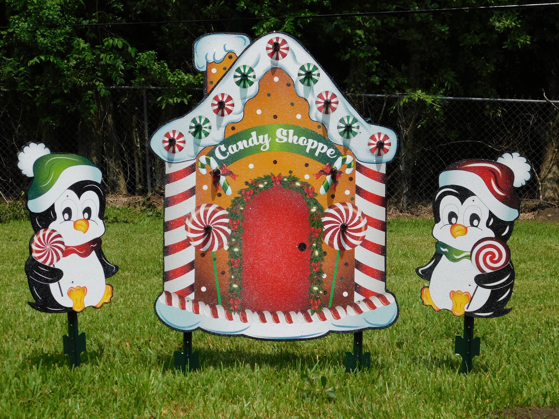 Christmas Lighted Candy Shoppe is 42" tall x 34" wide.  Each penguin is 22" tall x 13" wide.