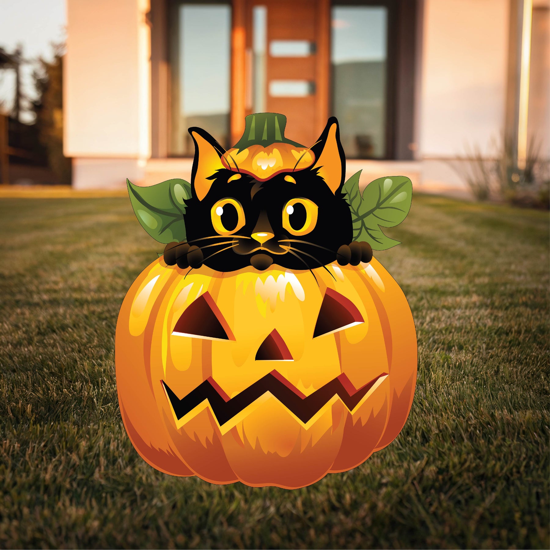 Add adorable spookiness to your lawn with this bright-eyed black cat peeking from a carved jack-o’-lantern! This sweet-meets-spooky sign is a must-have for cat lovers, pet moms, or Halloween enthusiastslooking to charm up their yard.