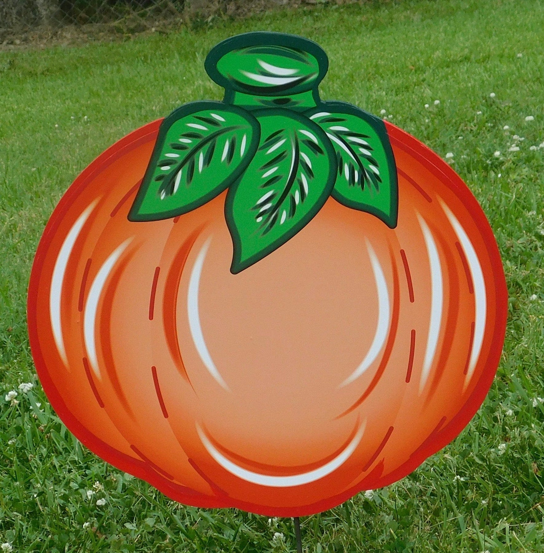 Enhance your autumn décor with the Medium Pumpkin with Stalk and Leaves Yard Art. This charming decoration features a classic pumpkin complete with a stalk and leafy accents, perfect for adding seasonal warmth to your yard or garden. Made from durable medium-density overlay material, it includes a steel rod for easy outdoor display.
