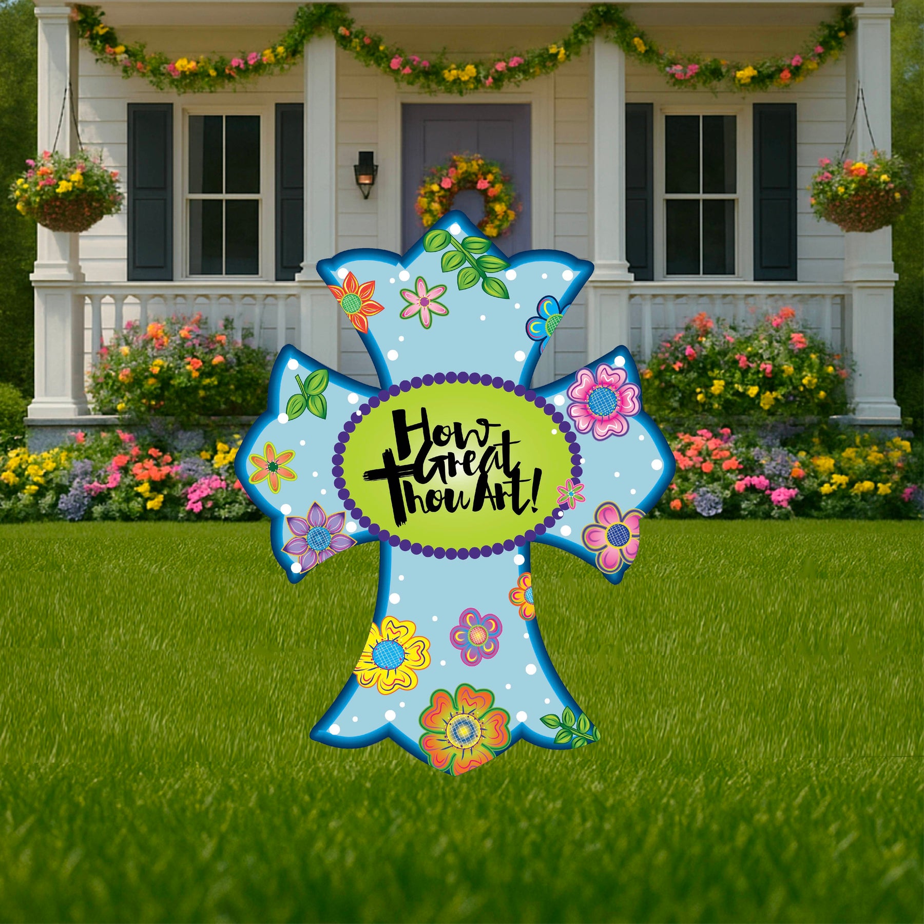 Celebrate your faith with this beautiful “How Great Thou Art” cross yard sign. Featuring a classic design inspired by the beloved hymn, it’s a meaningful addition to gardens, porches, or walkways. Whether you're decorating for the season or adding an everyday reminder of grace, this cross brings peace and inspiration to any outdoor space.