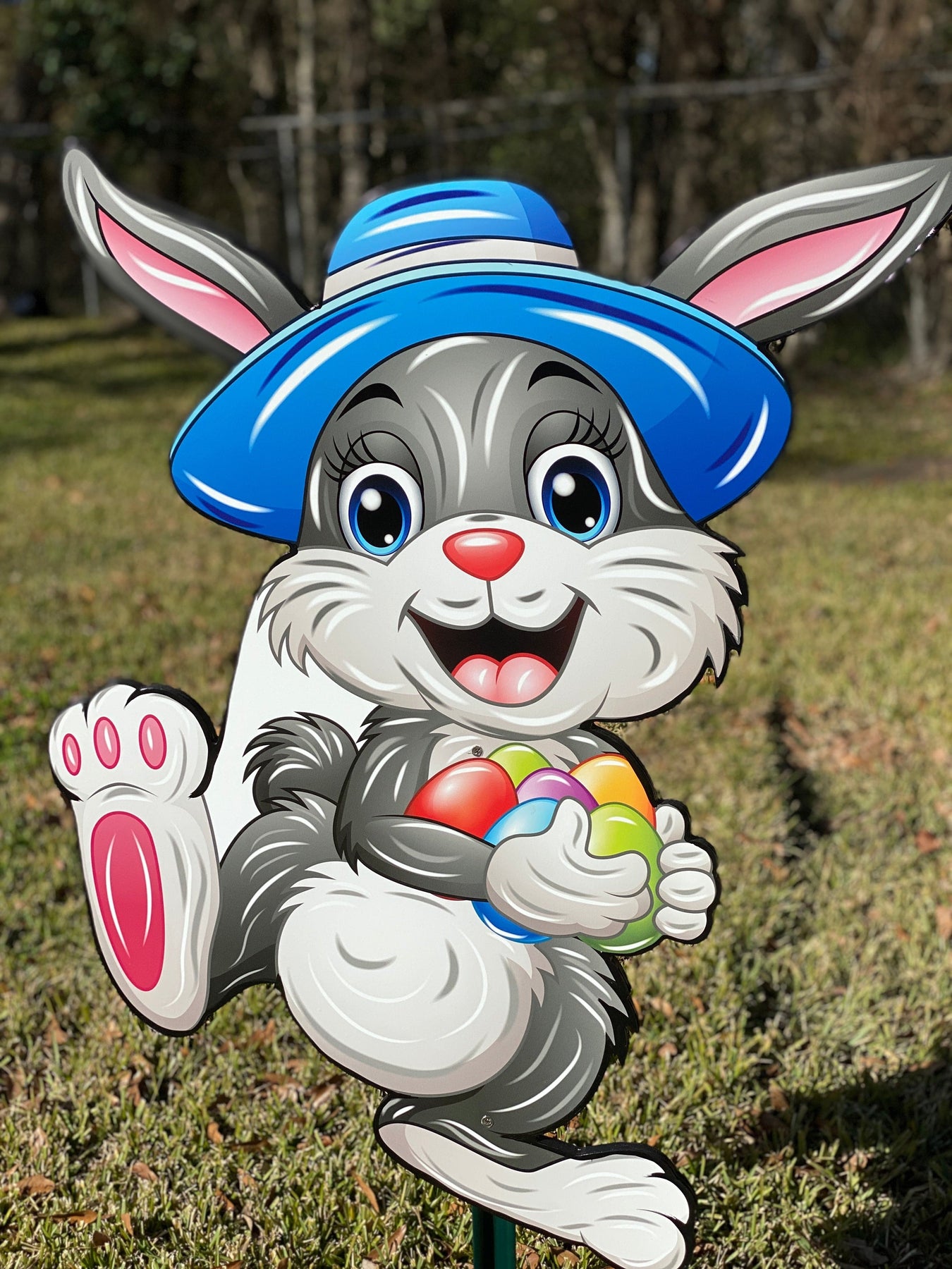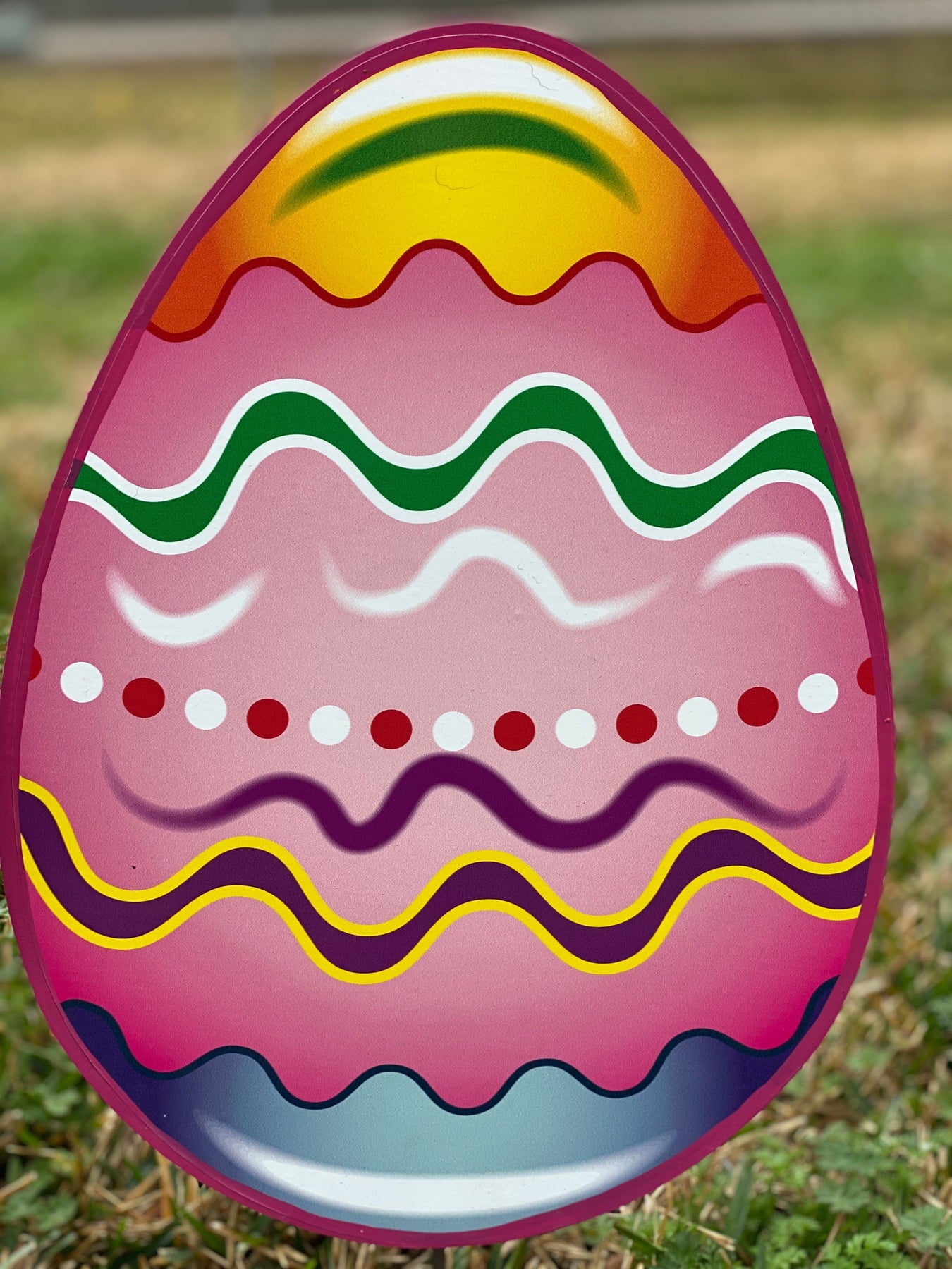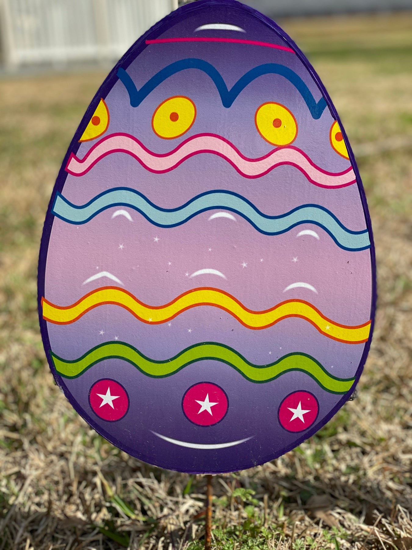 These colorful Easter pieces will brighten up your yard this Spring. This Bunny driving a car piece is 32" tall x 28" wide. The floppy ear bunny is 35"T X 29"W. Each Easter egg yard sign is 14"T X 10"W.