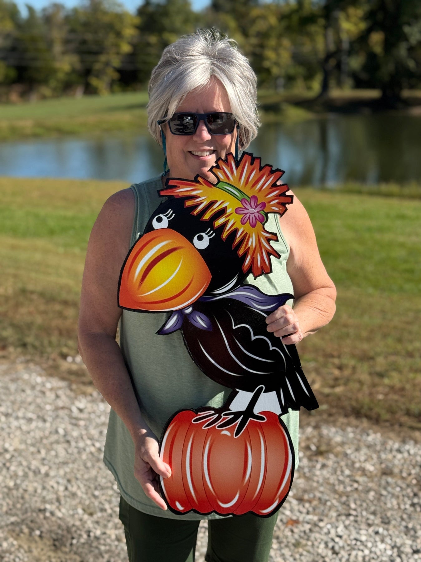 Looking for a whimsical fall gift for a garden-loving friend? This primitive crow yard sign perched atop a plump pumpkin is sure to make her smile! With its colorful sunflower hat and playful design, it’s perfect for adding charm to any autumn yard or porch.