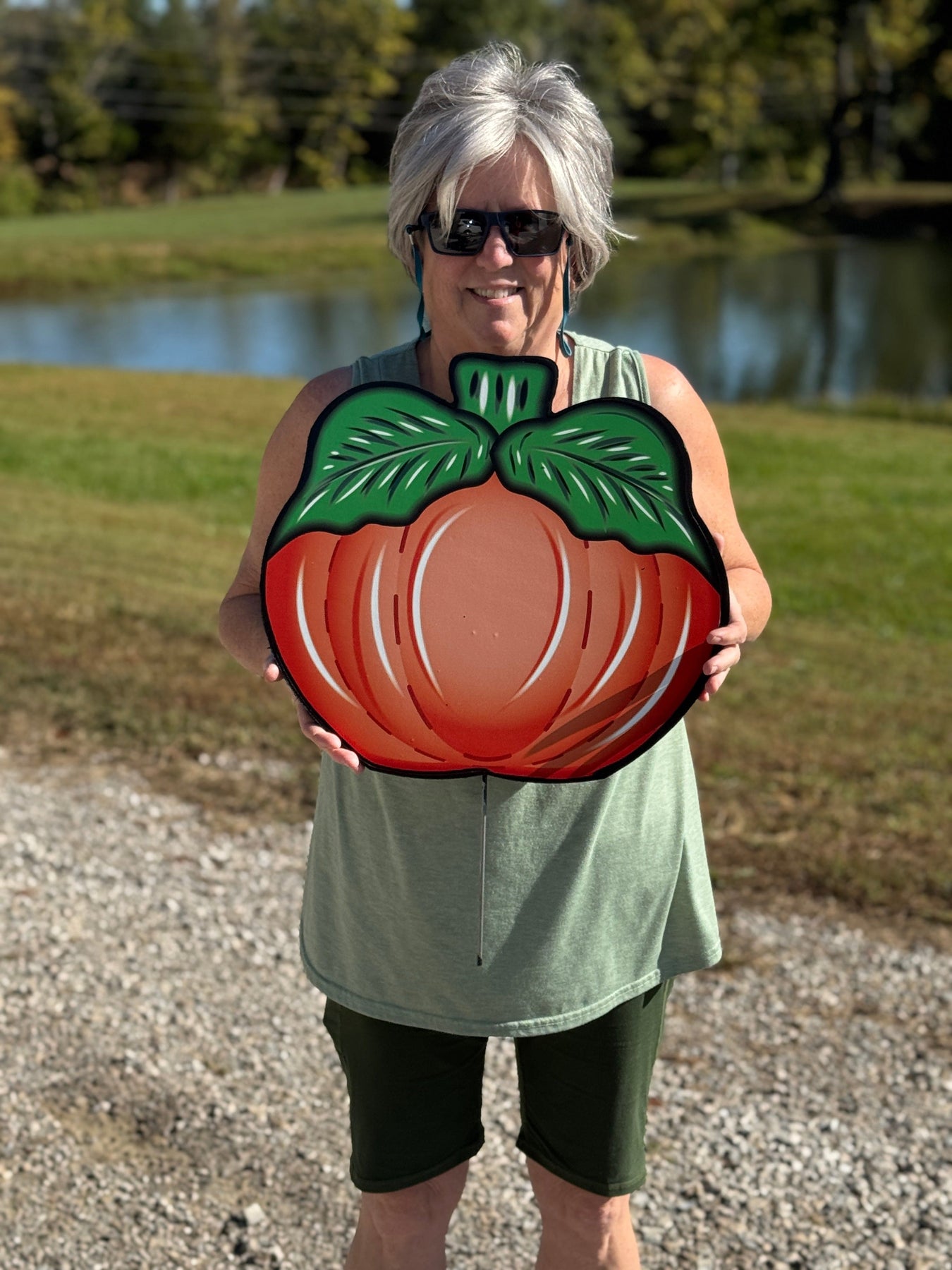 Pumpkin shaped yard art sign in orange with green leaf top.  All outdoor decorative yard signs come with stakes for easy placement and install.  Decorate your outdoor space - driveways, yards, gardens - even porches and decks.
