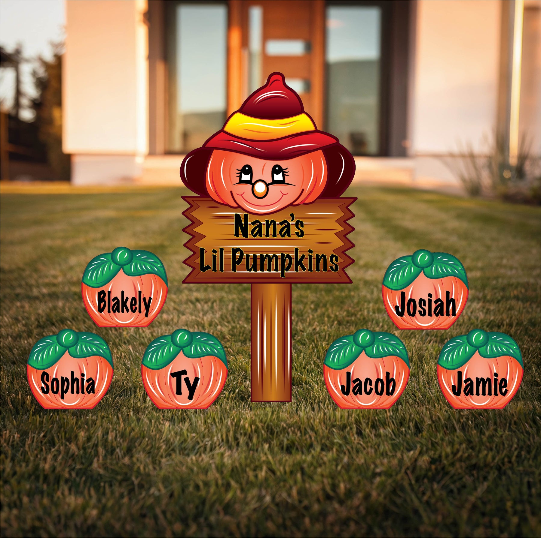 Celebrate the joy of being a grandparent with this personalized fall yard sign! Featuring a sweet pumpkin face wearing a fall hat and a sign that reads "Nana’s Lil Pumpkins", this rustic lawn decoration includes custom name pumpkinsfor each grandchild.