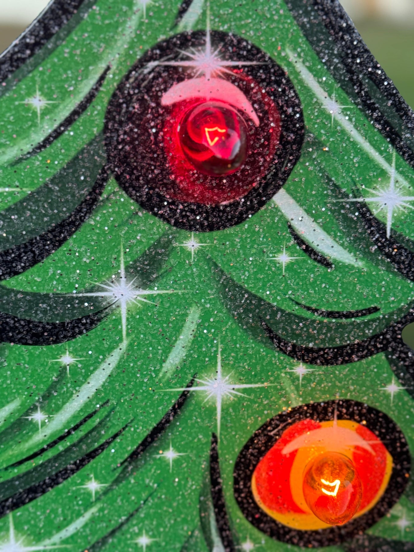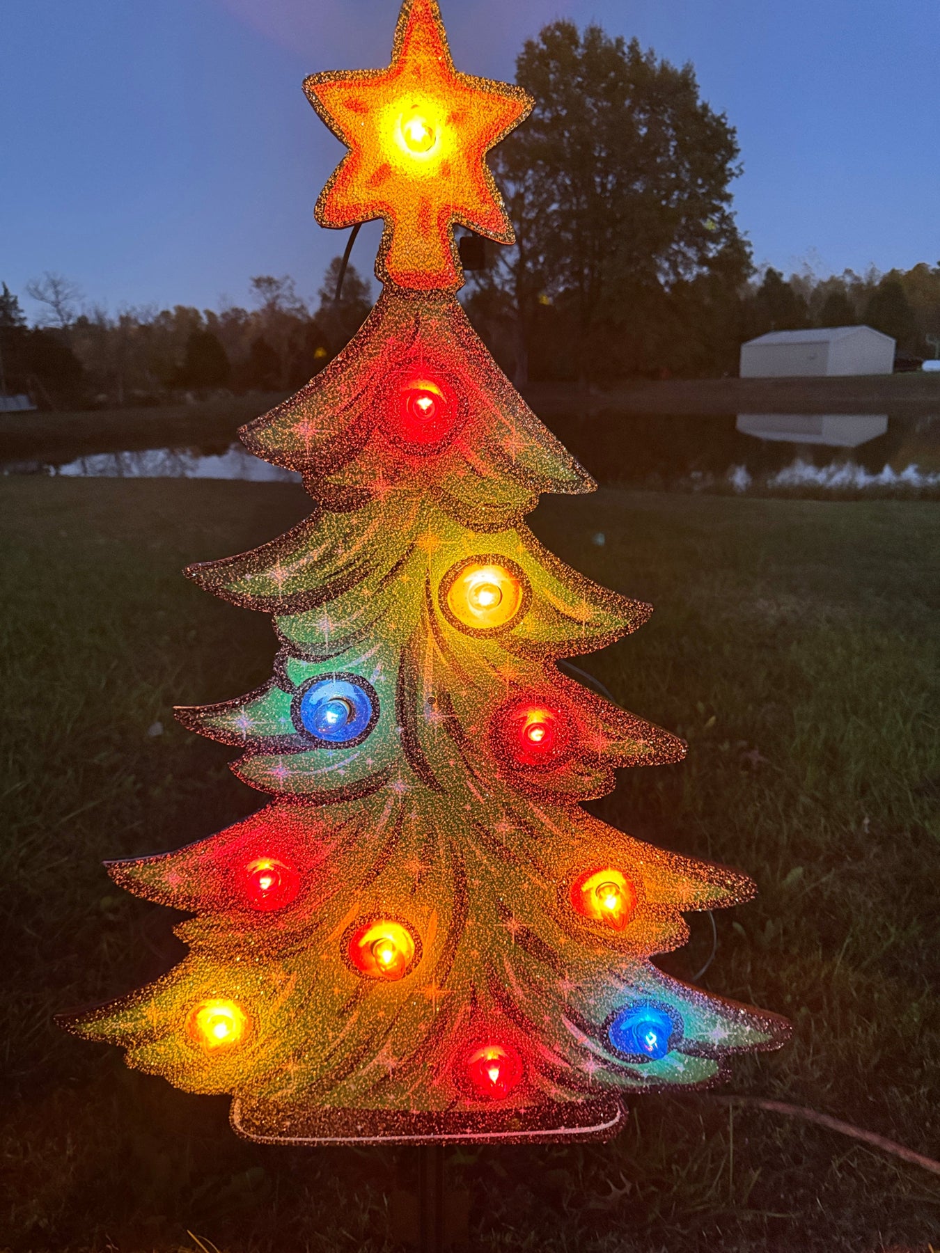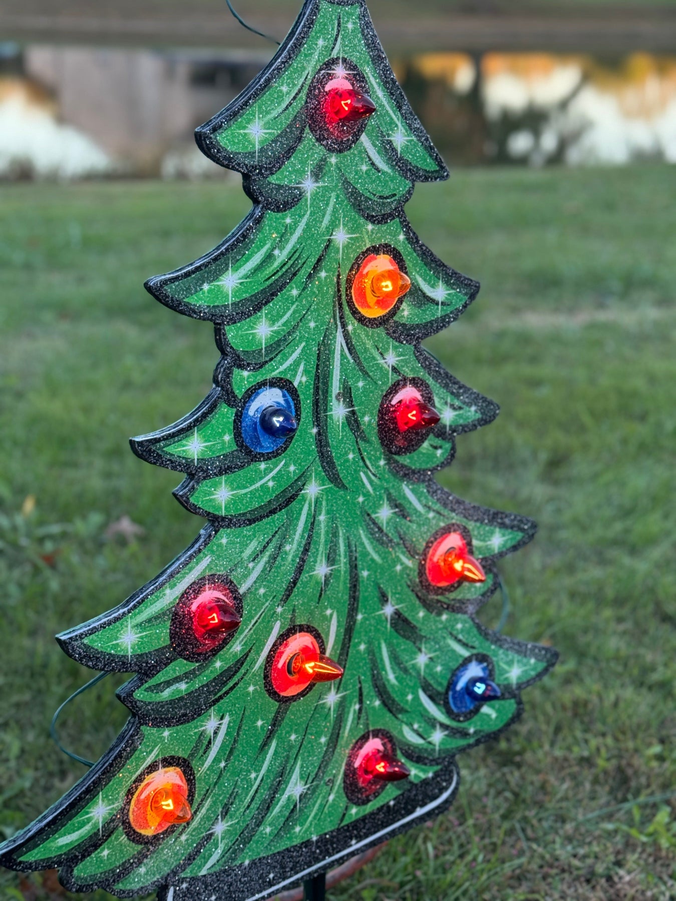 Christmas tree with lights and a glitter finish is 46" tall X 31" wide and will shine brightly at night with the 11 C9 light bulbs included.   Each candy canes is 22"T X 13.45W.  Each present is 15T X 20W.
